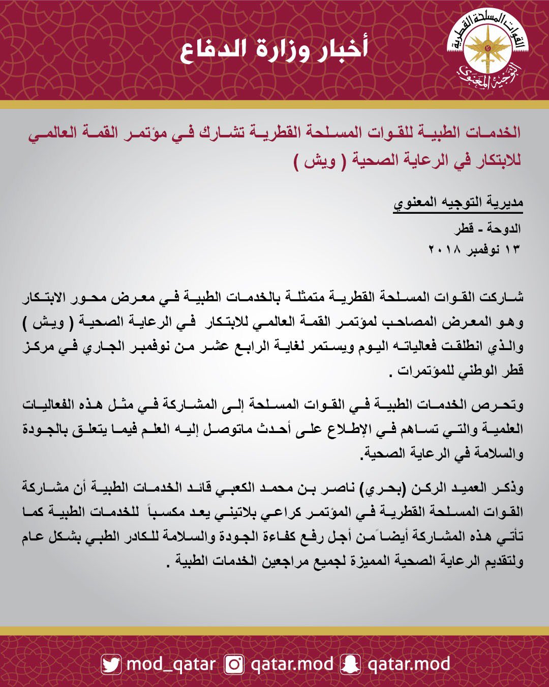 وزارة الدفاع دولة قطر Pa Twitter الخدمات الطبية للقوات المسلحة القطرية تشارك في مؤتمر القمة العالمي للابتكار في الرعاية الصحية ويش