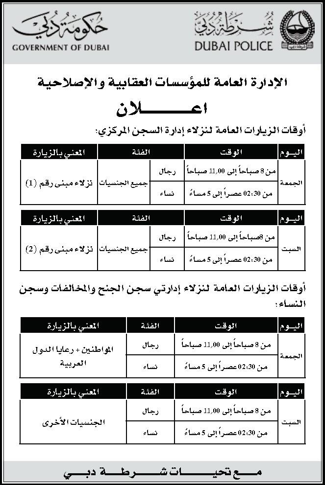 Dubai Policeشرطة دبي On Twitter إعلان أوقات الزيارات العامة لنزلاء إدارة السجن المركزي الامارات دبي شرطة Http T Co Wzlrayir8s
