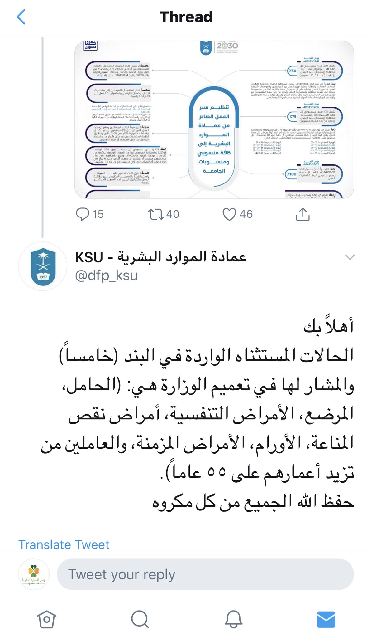 وصل للموارد البشرية On Twitter نظرا لعدم وجود التعميم رقم 8832 والمتعلق في الحالات المستثناه للحضو للعمل هنا توضيح من حساب عمادة الموارد البشرية بجامعة الملك سعود بعد استفسارهم عن الحالات